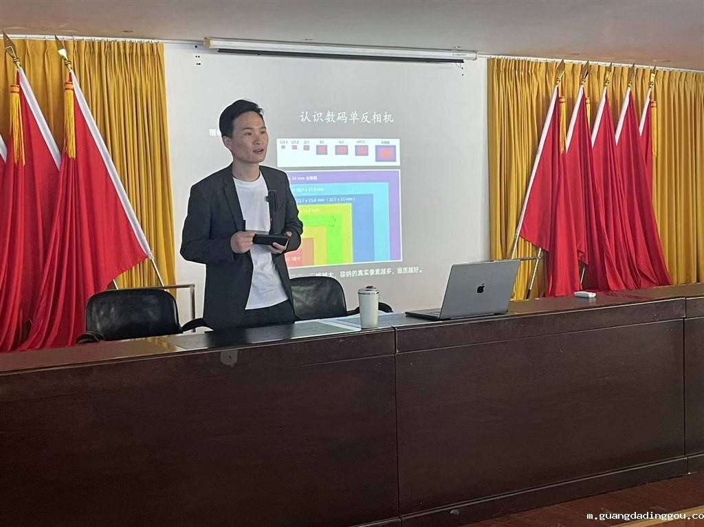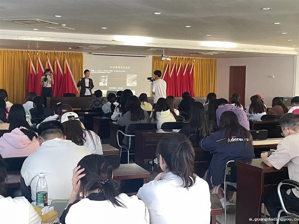 丁纯老师是常州高校影视实践联盟特约导师,并且是江苏上觉文化传播有限公司影视部CEO。会议伊始,丁纯老师像一位亲切的朋友一般,与同学们分享了他学生时代对摄影的浓厚兴趣。一下子拉近了与学生们的距离。他回忆起自己读书时,在生活费并不充裕的情况下,努力攒钱购买了一部心仪已久的相机,瞬间引起了许多同学的共鸣。随后,丁纯老师为同学们详细讲解了一些摄影知识并分享了自己的摄影作品,从基础的相机构造原理入手,深入浅出地向同学们讲解了参数设置和画面构图的重要性,如何通过简单的线条和色彩来增强画面的视觉效果;接着又将话题扩展到手机摄影的领域,从单反相机的专业设置到普通手机的拍摄技巧,涵盖了风景、人像等多种主题的拍摄方法。丁纯老师还详细解读了光圈、快门和感光度这些关键参数的数值设置,以及它们对画面质量的重要影响。此外,他还讲述了曝光、景深、焦距这些术语背后的实际应用,以及利用后期技术修复废片的技巧等等。